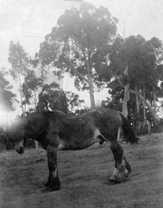 Although I was not born until 1917, I was quite small when I can remember my older brothers going out with their kangaroo dog to get a ‘roo for meat. The dog would run it down and kill it and then come back to show the boys where it was. These dogs were much like greyhounds but were bred to kill a ‘roo and show where it was without touching it. There was always a milk cow or two, a dozen or so chooks and ducks and our lovely, faithful, “all-round” horse, Nancy. We younger children all learned to ride on her and she would be harnessed up to the cart or sulky and off we’d go to visit etc. On Sundays one of us would hop on her back and canter up to the shop at Pickering Brook store to get the Sunday Times (cost four pence (five cents), which used to come from Perth on the midday train. Often the cows would wander off and then one of us had to go on Nancy to find them. The old horse knew every bit of the bush for miles around. Then, when the land needed ploughing or cultivating, the same horse would be used to do all that too. Oh yes, a good “all-round” horse was a great asset in those days.