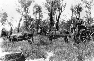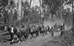 Until the First World War the district was known as Heidelberg but it was later renamed Carmel. The school and church was Wesleyan. It was quite isolated in those early years with the nearest neighbours one or two miles away. Dad continued working in the timber mills and was away from home all during the week, arriving home late on Saturday afternoons, often having to bring the team horses with him. My mum and the kids evidently set about clearing the bush so that eventually some fruit trees could be planted. Bullock drawn log teams used to pass through the block with their load of logs for some years until my brother Laurie was around two or three years old. All bread was home made – a sack of plain flour was always on hand, so that it would not be too new – old flour made the lighter bread.