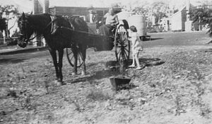 Times were very hard and people had very little money. Men worked very long hours for small wages and my dad often slept in the bush when he was log hauling or sleeper cutting. He would lean great slabs of bark stripped from jarrah logs up against a fallen tree and he would sleep underneath. There was no thought of complaining about conditions or the long hours worked. Mum worked just as hard. With no man around to help she had to do everything. Washing was all done in galvanised iron tubs using a washing board and boiled in a big iron cauldron over an open fire outside. Water was caught from the roof in wooden barrels and in summer time, to avoid having to carry water up to the house in buckets the washing would be taken close to the well where it could be easily dipped out. It was unheard of to walk up to the house (from the orchard) without carrying a bucket of water with you. It was many years before we got a 1000 gallon rainwater tank and my mother never had any plumbing in her lifetime. Dishes were washed up in the sink and the dishwater would be used to keep a precious plant alive. All the kids had their allotted jobs to do as we became old enough. Little ones had to feed the chooks and ducks, the next eldest had to tether the calf out while the oldest had the horse to feed and the cow to milk while another would be helping to get breakfast and make the school lunches.