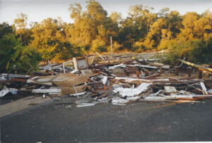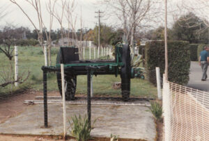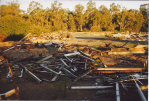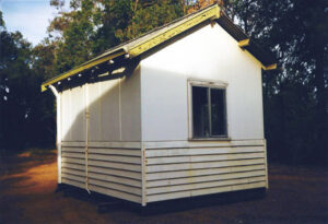 Barton’s Mill, 24 miles from Perth and eastward of Pickering Brook, was originally a timberworkers’ camp. It closed down about 1936, when the distance to stands of millable timber (as great as 40km) made the operation uneconomic. Also, the demand for sawn timber was low and Millars’ Timber and Trading Co. Limited diverted supply demands to their other sawmills. On closure, the buildings were sold to settlers and orchardists who dismantled them and carted them away. The houses were simple timber-framed cottages clad in rough sawn weather-boarding with an open front verandah and “settler’s chimneys” of timber. Some early dwellings appear to have been slab huts with camp ovens for cooking. Store buildings were timber framed and lined with corrugated iron sheeting. After the commencement of World War Two, a large stockpile of poorly sawn timber remaining at Barton’s Mill was purchased by Douglas Jones, timber merchants of Guildford. After redressing with a thicknesser, this timber was used in the construction of the RAAF huts at Pearce Air Base.