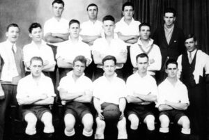 Middle Row: unknown, Mr Logie, unknown, unknown, Alex Hood, Manager. Front Row: Archie Thwaites, Jack Wallis, Les Moon, Harold Littley